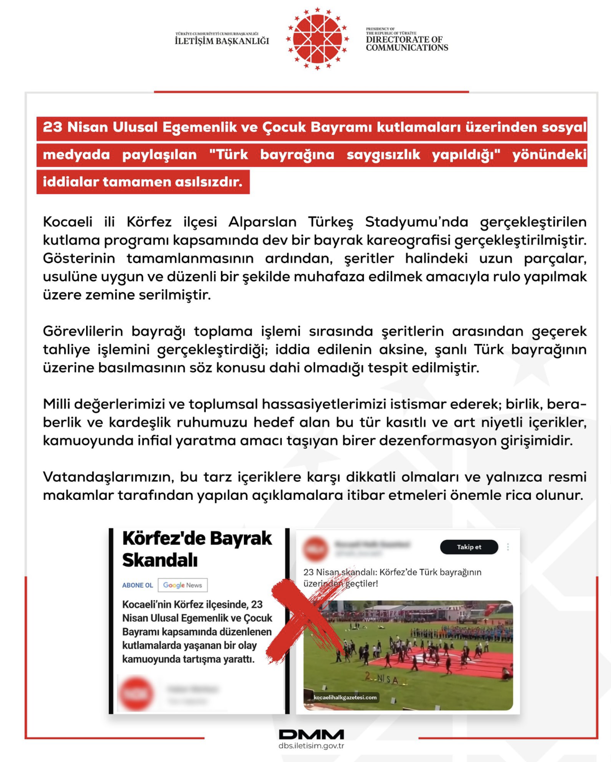 Dezenformasyonla Mücadele Merkezi (DMM), sosyal medyada son saatlerde gündeme gelen “Türk bayrağına saygısızlık” iddialarına ilişkin yazılı bir açıklama yaptı. Açıklamada, söz konusu görüntülerin Kocaeli’nin Körfez ilçesindeki Alparslan Türkeş Stadyumu’nda düzenlenen 23 Nisan Ulusal Egemenlik ve Çocuk Bayramı kutlamalarına ait olduğu belirtildi.