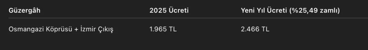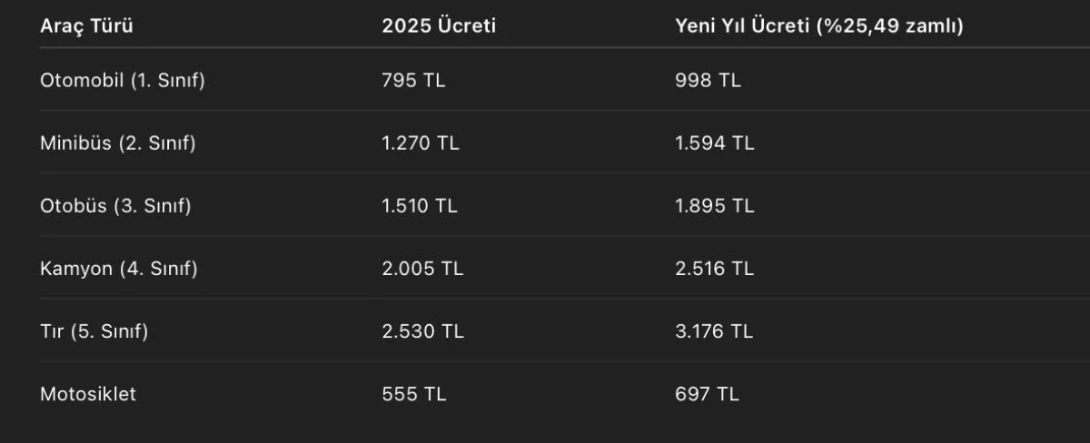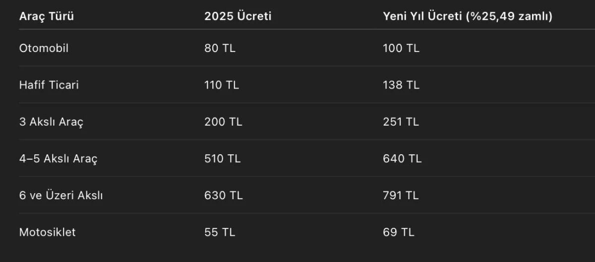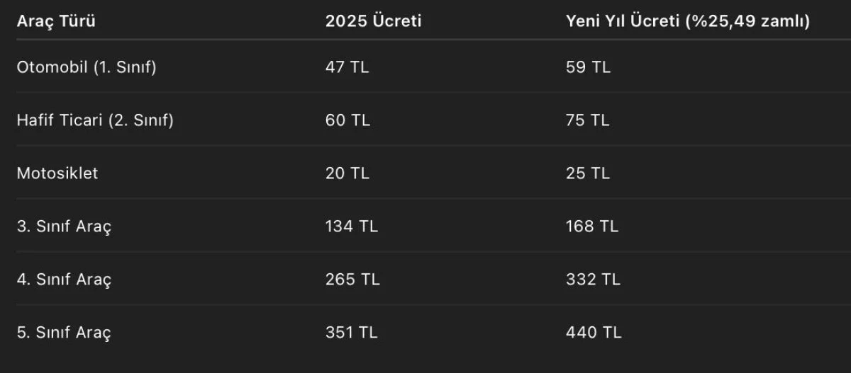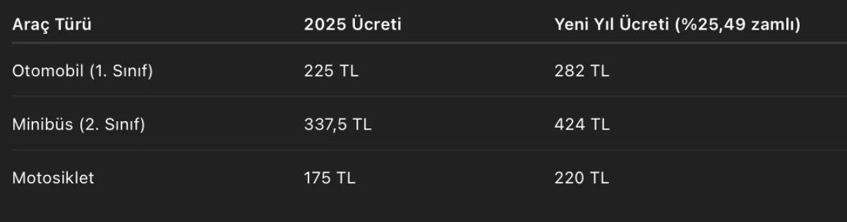 Yetkililer tarafından yapılan açıklamaya göre, köprü ve otoyol geçiş ücretlerine yüzde 25,49 oranında zam uygulanacak. Yeni ücret tarifeleri 1 Ocak 2026 tarihinden itibaren geçerli olacak.