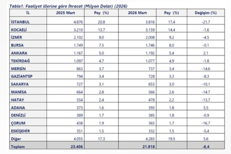 Öte yandan mart ayında ihracatını en fazla artıran iller de açıklandı. Buna göre Yalova 120 milyon dolarlık artışla ilk sırada yer alırken, Şırnak, Kırıkkale, Elazığ ve Düzce de dikkat çeken artışlar kaydetti.Küresel gelişmelerin etkisine rağmen Kocaeli’nin üretim ve ihracat gücü, ilin ekonomik açıdan stratejik önemini bir kez daha ortaya koydu.