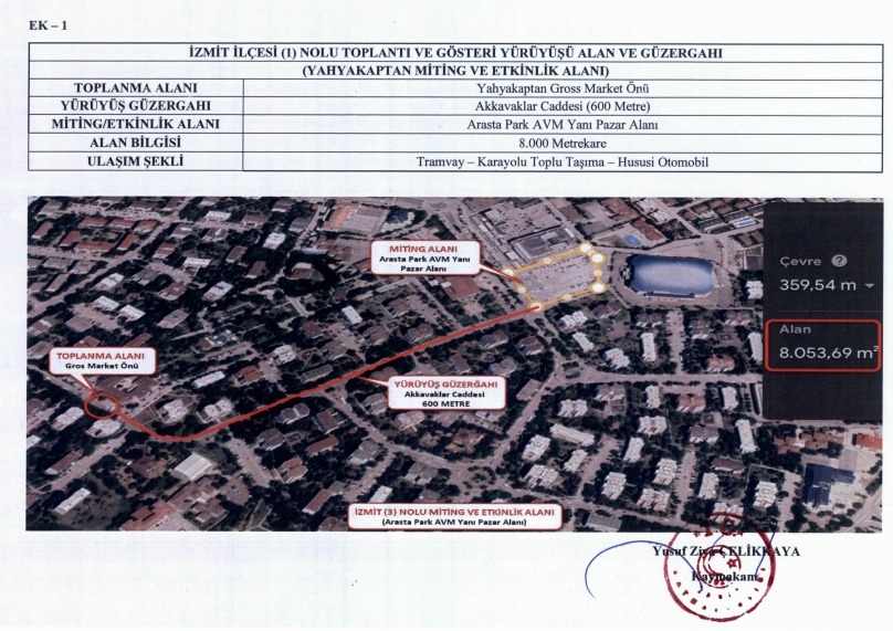 Belirlenen ilk alan Yahyakaptan Miting ve Etkinlik Alanı oldu. Toplanma noktası Yahyakaptan Gross Market önü olarak açıklanırken, yürüyüş güzergahı 600 metre uzunluğundaki Akkavaklar Caddesi olarak belirlendi. Miting ve etkinliklerin Arasta Park AVM yanı pazar alanında yapılacağı, alanın 8 bin metrekare büyüklüğünde olduğu bildirildi.