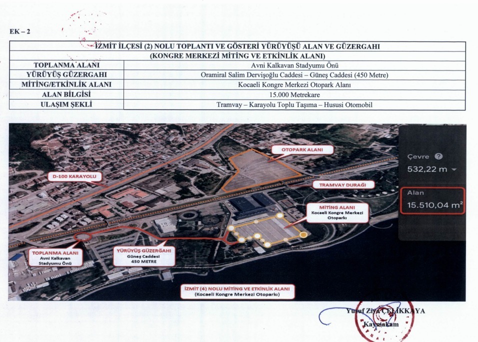 İkinci alan ise Kongre Merkezi Miting ve Etkinlik Alanı olarak açıklandı. Toplanma alanı Avni Kalkavan Stadyumu önü, yürüyüş güzergahı ise Oramiral Salim Dervişoğlu Caddesi ile Güneş Caddesi (450 metre) olarak duyuruldu. Miting ve etkinliklerin Kocaeli Kongre Merkezi otopark alanında gerçekleştirileceği ve alanın 15 bin metrekare olduğu kaydedildi.