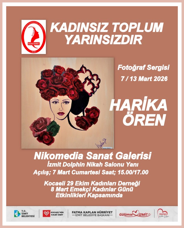 İzmit Belediyesi Nikomedia Sanat Galerisi, 7 Mart Cumartesi günü özel bir sergiye ev sahipliği yapıyor. 29 Ekim Kadınları Derneği iş birliğiyle gerçekleşen sergide, sanatçı Harika Ören’in “Kadınsız Toplum Yarınsızdır” adlı kişisel fotoğraf çalışmaları yer alıyor. Sergi, doğa ve kadının ilişkisini merkeze alarak, şehrin gizli köşelerinde saklı kalan hikayeleri görünür kılmayı amaçlıyor.