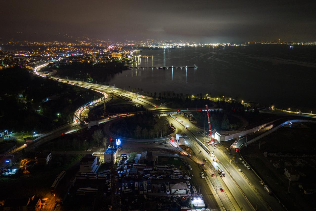 Kocaeli Büyükşehir Belediyesi kentin dört bir yanında dev projeler hayata geçirirken, ekipler gece mesaisi de yapıyor. Başiskele Kavşağı Koridor Projesi kapsamında D-130 Karayolu ile Ömertürkçakal Bulvarı bağlantısını sağlayacak direksiyonel kavşağın devasa kirişlerinin montajı da gece saatlerinde gerçekleştirildi. Ekipler, trafiğin aksatılmaması için montaj çalışmalarına saat 01.30’da başladı.