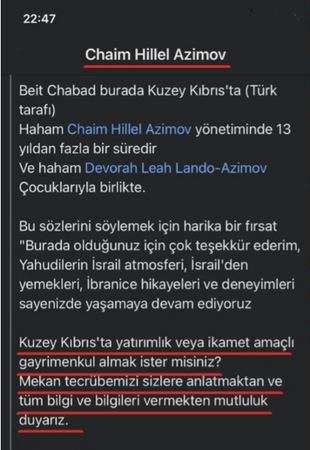 Aynı gün tarafımıza ulaştırılan bir belgeye göre KKTC’de illegal faaliyet gösteren Chabad temsilcisi Hillel Azimov, “Kuzey Kıbrıs’ta yatırımlık veya ikamet amaçlı gayrimenkul almak ister misin?” sorusu geldi.
