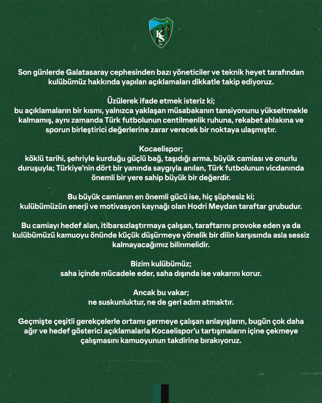 Kocaelispor, son günlerde Galatasaray cephesinden yapılan açıklamalara ilişkin kamuoyuna dikkat çeken bir duyuru yayımladı. Kulüp, bazı yöneticiler ve teknik heyet tarafından yapılan ifadelerin yaklaşan karşılaşma öncesinde tansiyonu yükselttiğini ve Türk futbolunun centilmenlik ruhuna zarar verdiğini savundu.