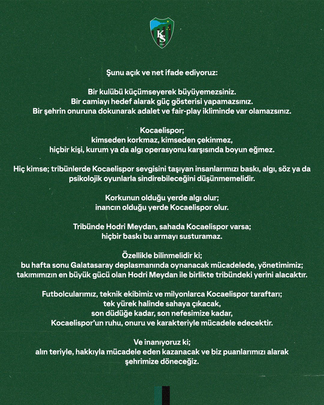 Açıklamada, Kocaelispor’un köklü tarihi, güçlü taraftar yapısı ve onurlu duruşuyla Türk futbolunda önemli bir yere sahip olduğu vurgulanırken, özellikle taraftar grubu “Hodri Meydan”ın hedef alınmasına tepki gösterildi. Kulüp, camiayı itibarsızlaştırmaya yönelik söylemler karşısında sessiz kalmayacaklarını belirtti.