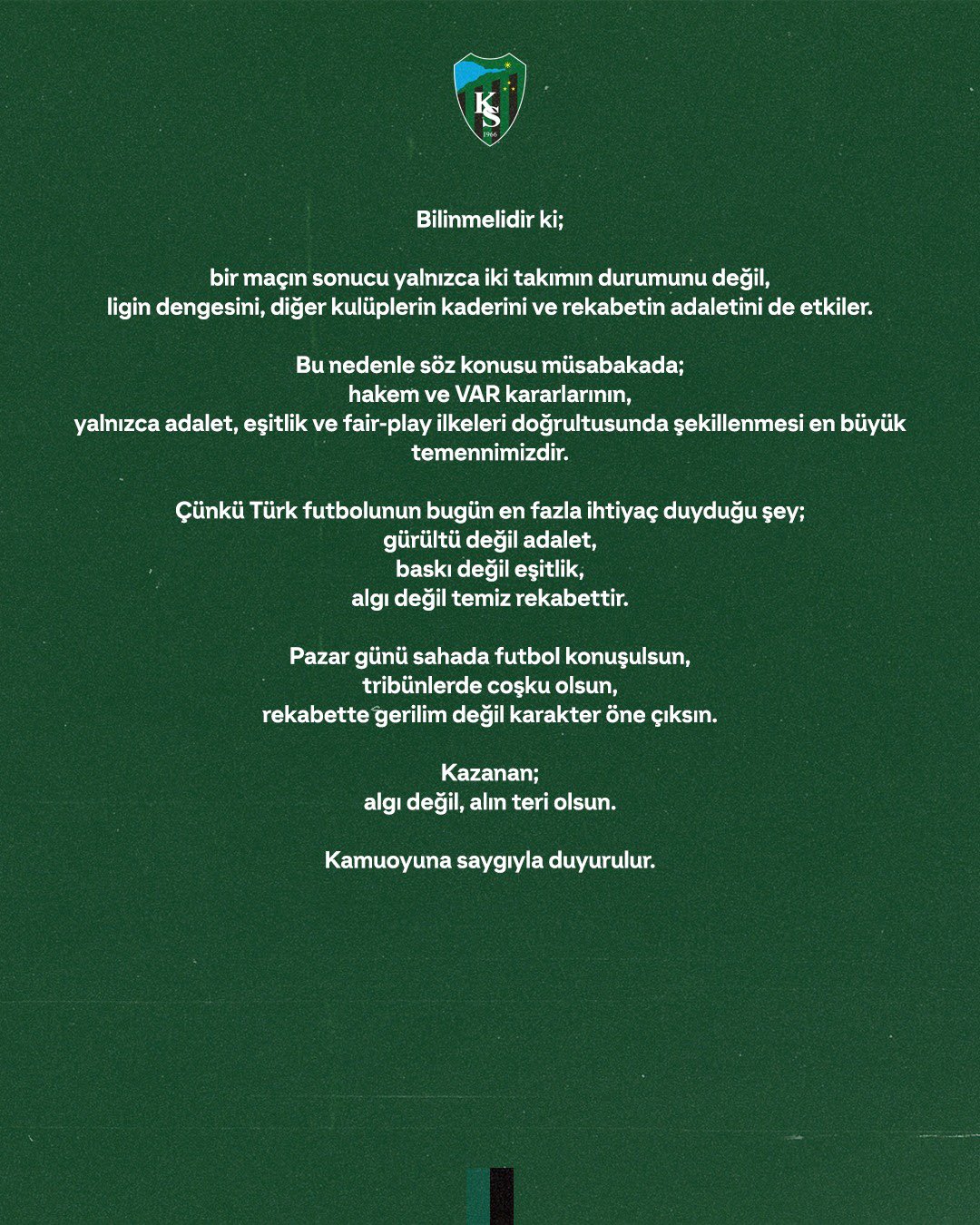 Kocaelispor, Türk futbolunun en çok ihtiyaç duyduğu unsurların gürültü değil adalet, baskı değil eşitlik ve algı değil temiz rekabet olduğunu vurgulayarak, karşılaşmada futbolun ön planda olması temennisinde bulundu.